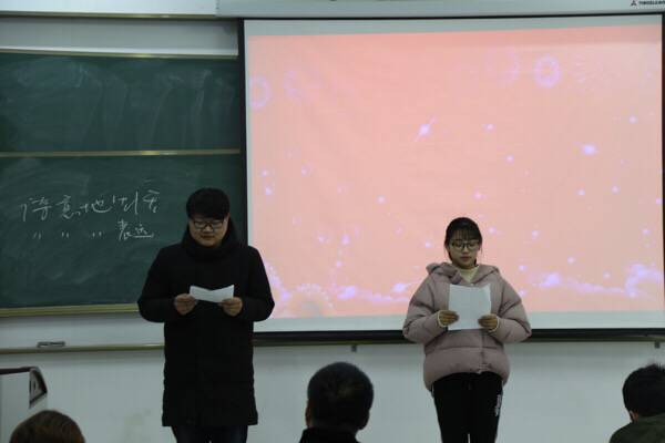 首先,赵有广引用名句“山再高,往上攀,总能登顶;路再长,走下去,定能到达”来勉励同学们要学会诗意地生活、诗意地表达自己的感受。接着,比赛正式开始,以组合形式参赛的陆旺和潘家钰以一首《唐诗里的中国》带着同学们领略了唐诗那独具韵味的风采;郑崎的《我的中国性格》激发了同学们慷慨激昂的爱国之情;周晓凡的《傅雷家书》让观众们感受到父亲对儿子浓浓的爱;叶成媛和王景程以一篇《枸杞花开》将比赛推向高潮,观众们热烈的掌声不断响起。最终叶成媛和王景程组合获得了此次比赛的第一名。比赛结束,评委对选手们做了简明扼要的点评,指出了同学们朗诵中语调把控力仍需加强,个别同学可能比较紧张有失水准导致发挥失常,称赞了所有选手对于比赛的用心准备。