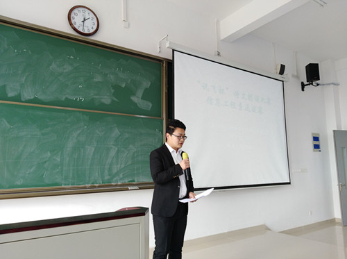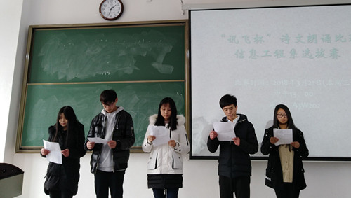 本网讯 胸藏文墨虚若谷,腹有诗书气自华。为了提升大学生道德情操,继承和弘扬中华民族优秀传统文化,加强校园文化建设,2018年3月21日13时,信息工程系在新芜校区A3教学楼W202教室举行“讯飞杯”诗文朗诵比赛系部选拔赛。信息工程系团总支书记华静、学生党支部书记吕海涛、辅导员汪保国、余欢欢、于凯烁、田婷婷、陈欣老师应邀担任本次比赛评委。