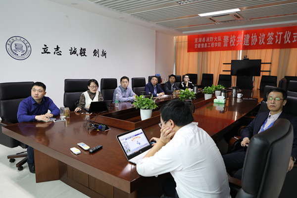 本网讯 3月27日下午,学院在新芜校区图书馆八楼1号会议室召开智慧平安校园建设推进会。科大讯飞智元公司设计部工程师李晓明、黄敏,百得思维产品研发部刘啸经理,教务处处长汪忠国、保卫处副处长张祥、后勤处卡务中心杨靖榕老师等参加了会议。