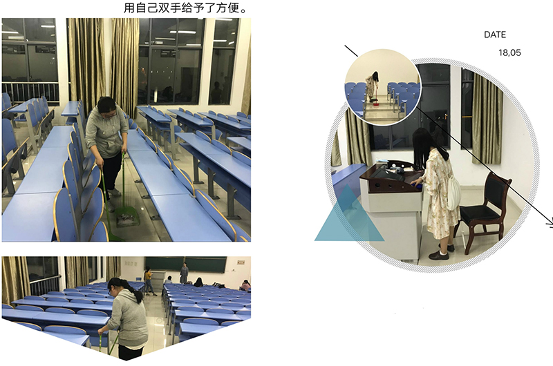 他们的责任是让使用了一天后的教室焕然一新,教室打扫是一项非常艰辛的工作,但他们不怕脏,不怕累,分工明确,配合默契,带走教室里的每一片垃圾。他们让地面光洁如新,教室环境摇身一变,连最细微之处也不放过。