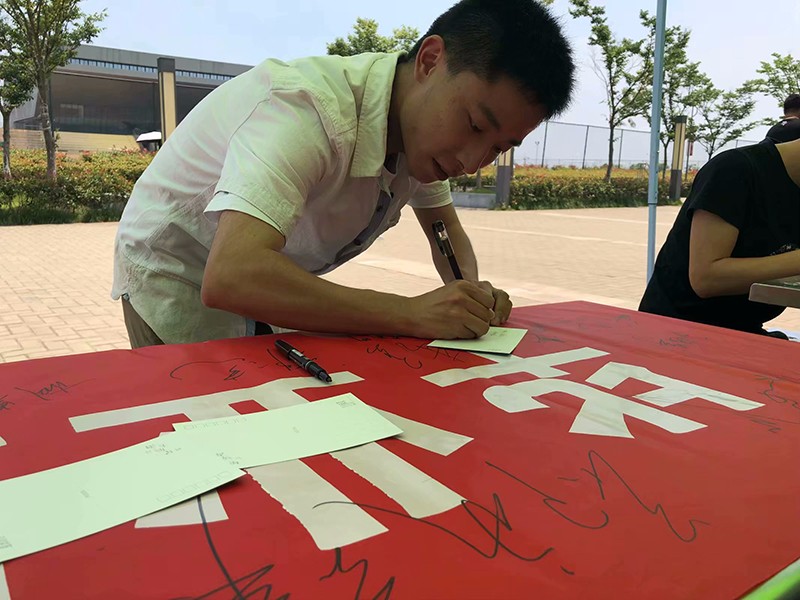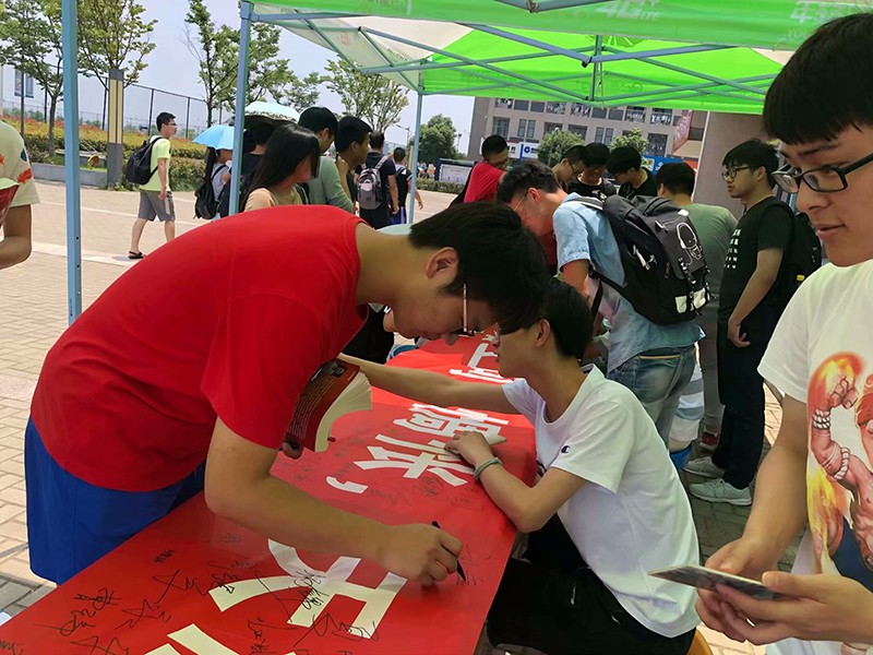 本网讯 6月17日,我校学生楼栋管理委员会在新芜校区食堂门口举办了“毕业季”心语信箱活动,活动现场热情的同学们在横幅上签上他们的名字,书写明信片送给学长学姐们,以此来表达对毕业生的祝福。