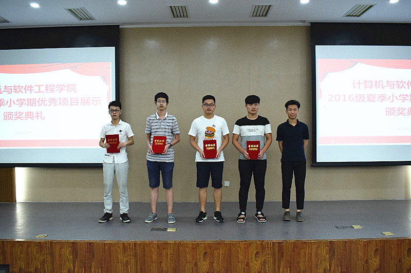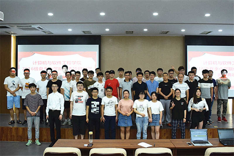 本网讯 7月20日上午,计算机与软件工程学院在文津校区东二503多媒体教室举办了16级夏季小学期优秀项目展示会,本次展示会项目团队由各班级交叉评审中脱颖而出的20支队伍组成,孔凡豹、翟世臣、张松云、王元玮、蔡兵五位老师担任评委,各班助教与16级学生代表共同参与了本次展示会。