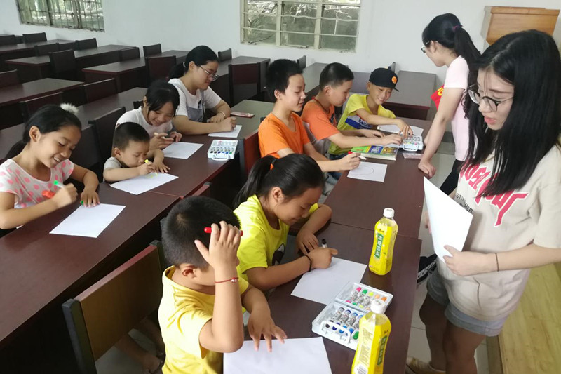 次日,实践团队来到了濮塘镇活动中心,和可爱的留守孩子们近距离接触,为他们的学习、生活添上了一道色彩。温馨的时光从队员为孩子们分发画笔开始,学生为孩子们详细讲解绘画的各种技巧以及绘画要点。孩子们目不暇视,大眼睛中满是对知识的渴求。这期间孩子们自由作画,歪着小脑袋,摸索着他们眼中的世界。但是,孩子们却不约而同地围绕着“家”这个主题,稚嫩的小手画着记忆中的爸爸妈妈。活动结束后,队员为小朋友送去了精心准备的小礼物,当队员们收拾东西准备离开时,孩子们流露出了依依不舍的目光。