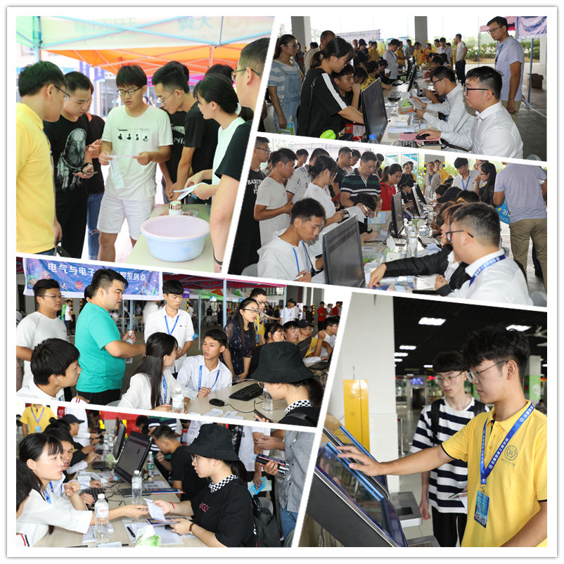 (新生报到现场忙碌而有序,工作人员热心且耐心,志愿者全方位服务和介绍)