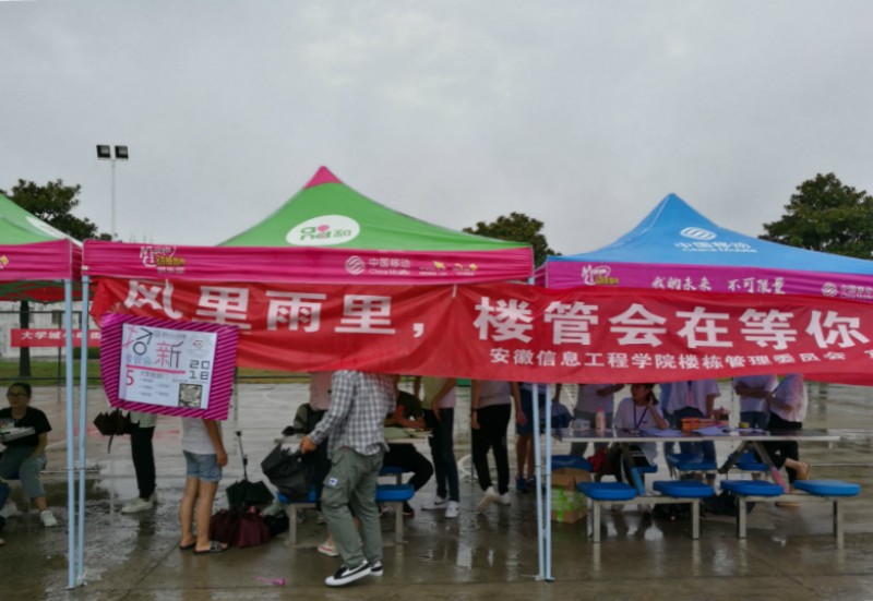 本网讯 9月24日,我校学生楼栋管理委员会2018年招新工作在新芜校区陶然餐厅广场开展,虽然天空飘着小雨,但并不影响同学们的热情,招新现场气氛火热。