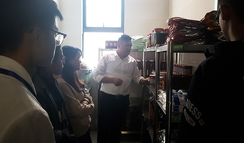 (图为食堂经理向学生代表介绍仓库科学管理)