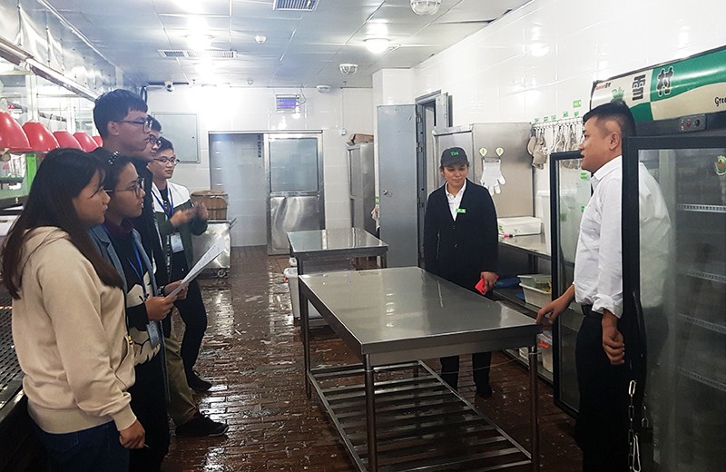 在食堂经理的引导下,同学们先后参观了餐厅后堂的验货区、粗加工间、面点间、洗消间、主副食仓库、烹饪间等多个功能间,实地了解了食品从采购到售卖的全过程。通过交谈,还了解到食堂原材料来源、碗筷消毒、卫生管理等方面的情况。