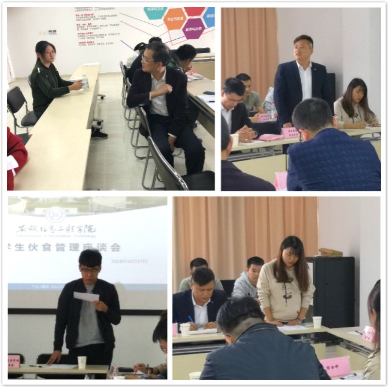 本网讯 10月17日、31日下午,我校师生伙食管理工作座谈会分别在新芜、文津校区举行。副院长程业涛,后勤管理处处长张援全、副处长汪涛、综合科主管章炜、伙管会学生代表、各学院学生代表、教职工代表、各餐饮单位经理参加了会议,与会人员就如何加强食堂管理改善服务质量进行座谈。