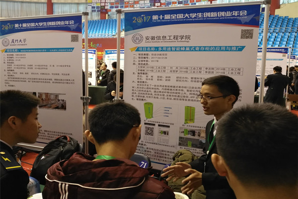 参加此次年会成果展示的共有创新创业展示项目188项、学术论文166篇、创业推介项目49项。而此次年会中展示的188件创新创业展示项目是2015年至2017年间由教育部立项的全国10万件大学生创新创业项目中经推荐和遴选出的,我院学子的项目“多用途智能蜂巢式寄存柜的应用与推广”也入选此次创新创业展示项目。该项目的专利作品智能蜂巢式寄存柜构造独特,并与移动电商结合可在市场中广泛运用,已获得实用新型专利授权,发明专利已进入实审;并先后获得芜湖市大学生专利创新创业大赛特等奖、安徽省大学生电子商务三创赛特等奖和全国大学生电子商务三创赛二等奖等各类奖项。在年会展示中,该作品博得很多高校师生的兴趣和称赞。