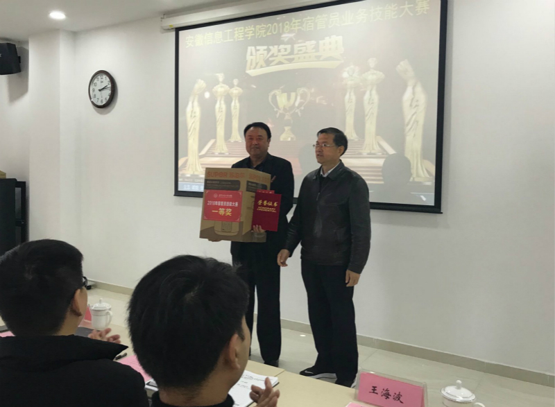 本网讯 11月29日下午,由后勤管理处主办,安徽昭阳物业公司、安徽新亚物业公司承办的“2018年宿管员业务技能大赛”颁奖典礼在新芜校区图书馆8楼培训室隆重举行。受邀担任颁奖嘉宾的有副校长程业涛、后勤管理处处长张援全、安徽昭阳物业公司芜湖分公司经理王海波、安徽新亚物业公司芜湖分公司经理汤慧民。