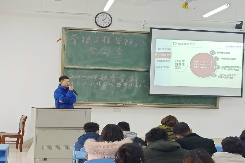本网讯 为了加强学生会组织工作,推进组织的健康发展。管理工程学院学生会于1月11日在A3N202举行了2018--2019秋季学期第三次全体会议,主席团成员及各部门部长进行了年终述职。院团总支书记、学生会指导老师张婷婷以及学生会全体人员出席了本次会议。