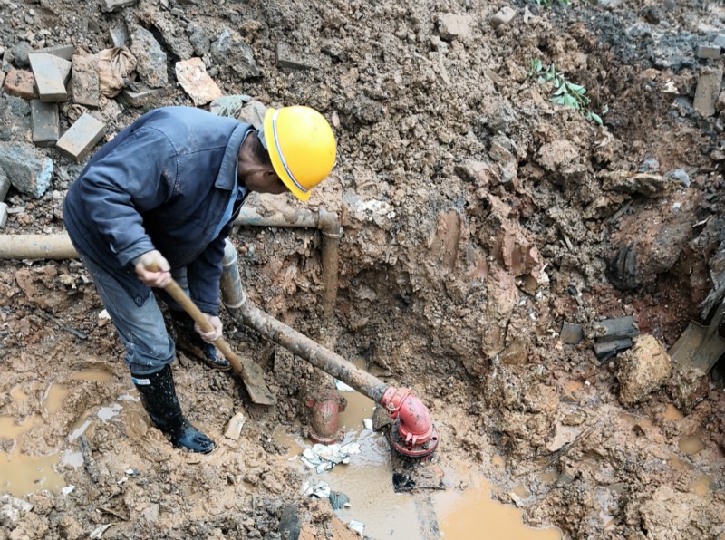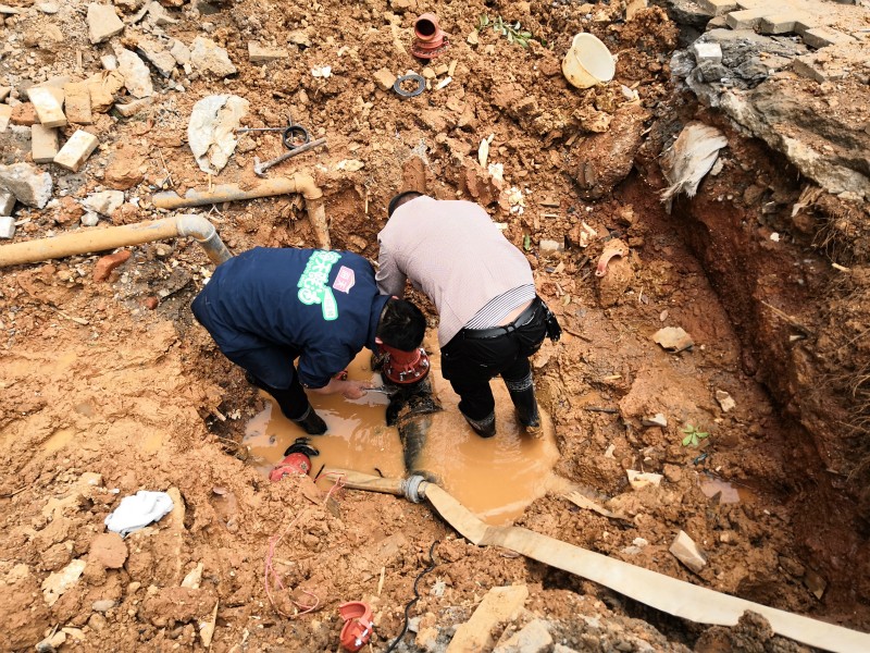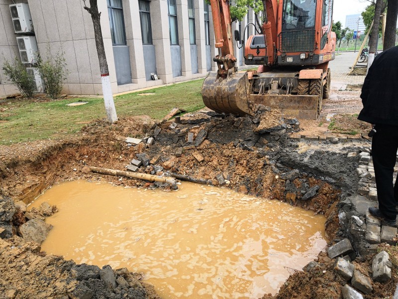 抢修现场,后勤管理处会同物业公司、基建维修框架施工单位组成抢修组,从排查具体爆管点,分析供水管线走向,关闭前后管道阀门等抢修措施着手,争分夺秒有序推进抢修工作。鉴于爆管区域紧邻人行道路灯,地下水电管网交错复杂,给抢修工作造成一定难度。经过二次勘查,抢修组决定采取边清理边开挖的抢修方式指导挖机作业。