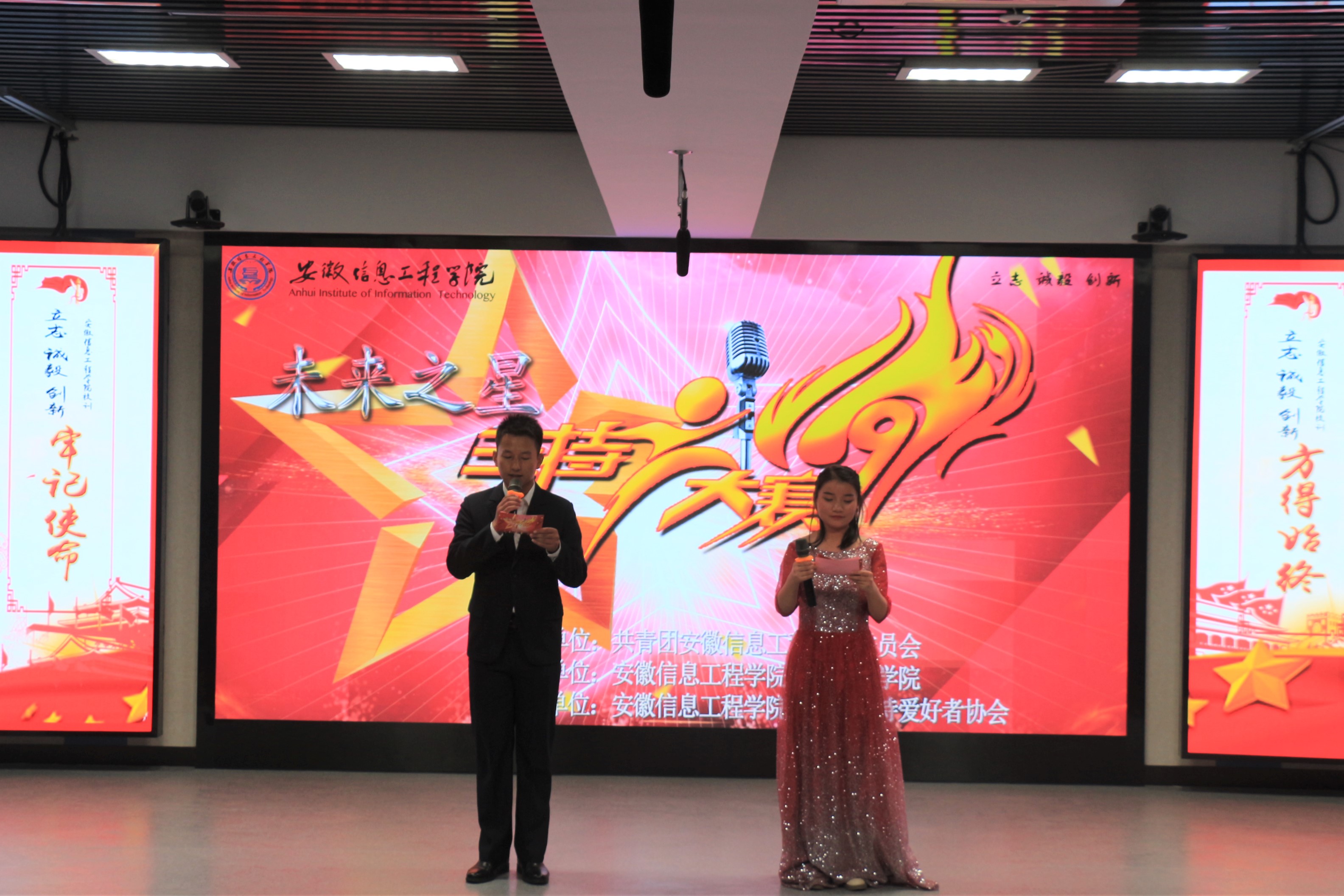 本网讯 灿烂的微笑,青春的面孔,激情洋溢的声音,在舞台上尽情绽放。2019年11月10日下午,安徽信息工程学院第五届“未来之星”主持人大赛决赛在A3W401教室绚丽开幕。大赛邀请了安庆市广播电视台新闻播音员桑乐,宣城市广播电视台编导汪敬儒,泾县广播电视台新闻播音员沈澳作为特邀嘉宾出席大赛并担任评委。