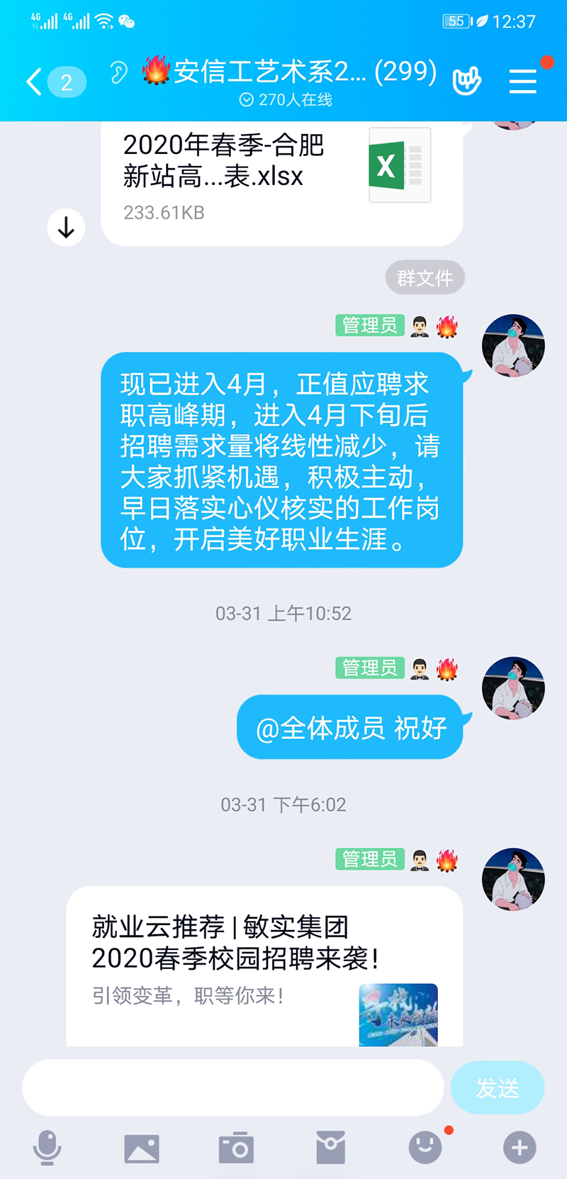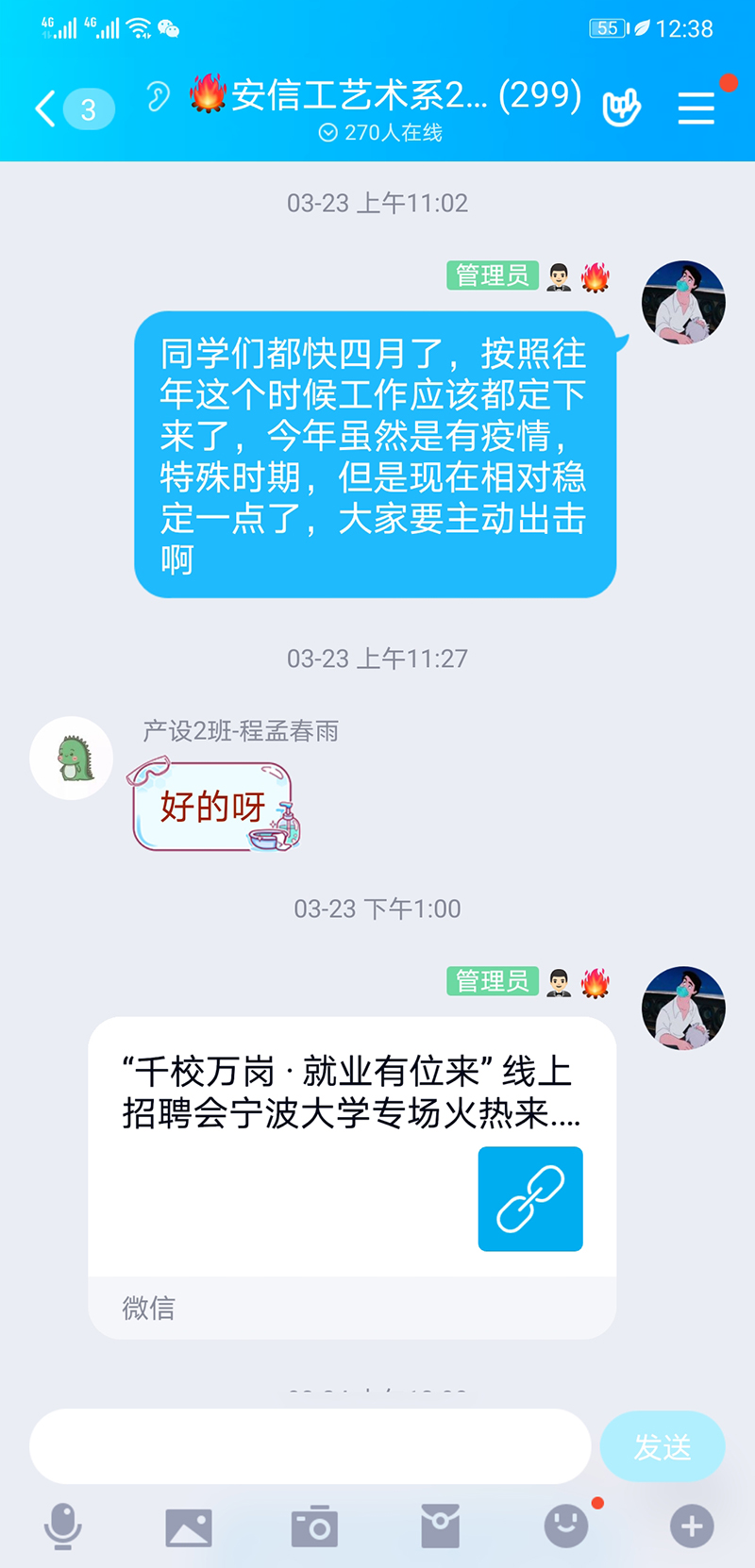 在指导帮扶毕业生的同时,学院主动对接用人单位,邀请用人单位在疫情防控期间举办各类线上招聘,推荐优秀毕业生赴校友企业实习就业,广泛开拓就业渠道。疫情发生以来,学院通过就业信息网、QQ群、微信公众号等多种途径,持续推送优质岗位信息;举办线上招聘会;筹办线上大型双选会。