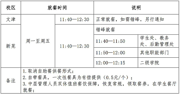 5月16日起,学生餐厅恢复供餐,错峰就餐时间段安排如下: