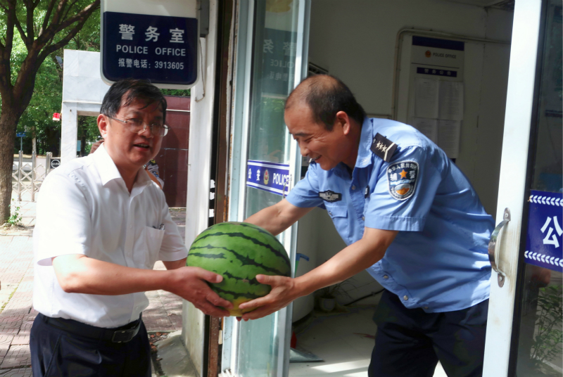 上午由校长吴敏,副校长、纪委书记程业涛带队,下午由党委书记汪奇燕,副校长、纪委书记程业涛带队,分别走访慰问了两校区各安保岗亭处、校警务室、维修中心、环卫保洁、绿化以及施工现场等工作点,了解假期工作和值班情况,对他们的辛勤工作给予了高度赞扬,并为他们送上了西瓜、饮料等防暑降温食品,同时还叮嘱大家要时刻把健康和安全放在第一位,务必做好防暑降温,注意劳逸结合。