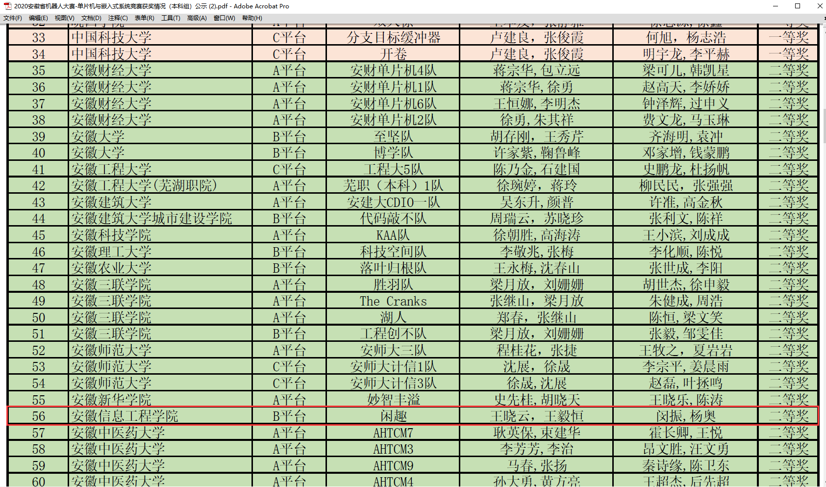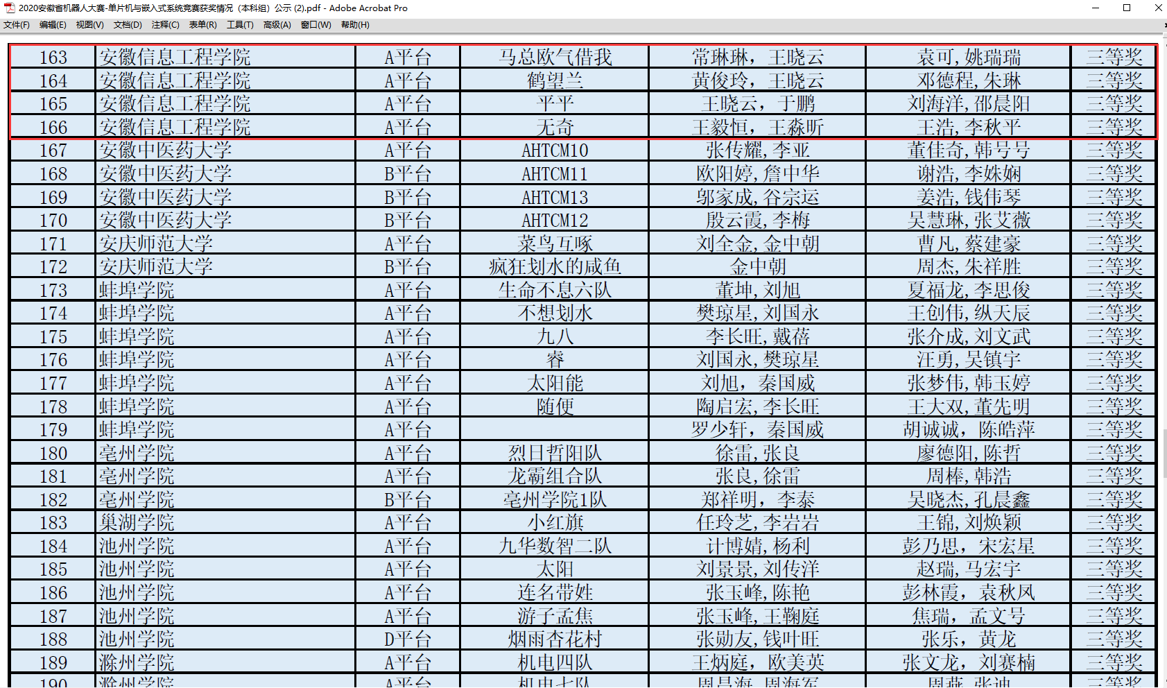 本网讯 11月1日,“安徽省机器人大赛-单片机与嵌入式系统竞赛”圆满落下帷幕。在各参赛队员和指导教师的共同努力下,闵振、杨奥和袁可等同学结合各自专业特长,充分发挥主观能动性,按照要求在4个小时内完成了比赛项目,最终取得了一个二等奖和四个三等奖的好成绩。