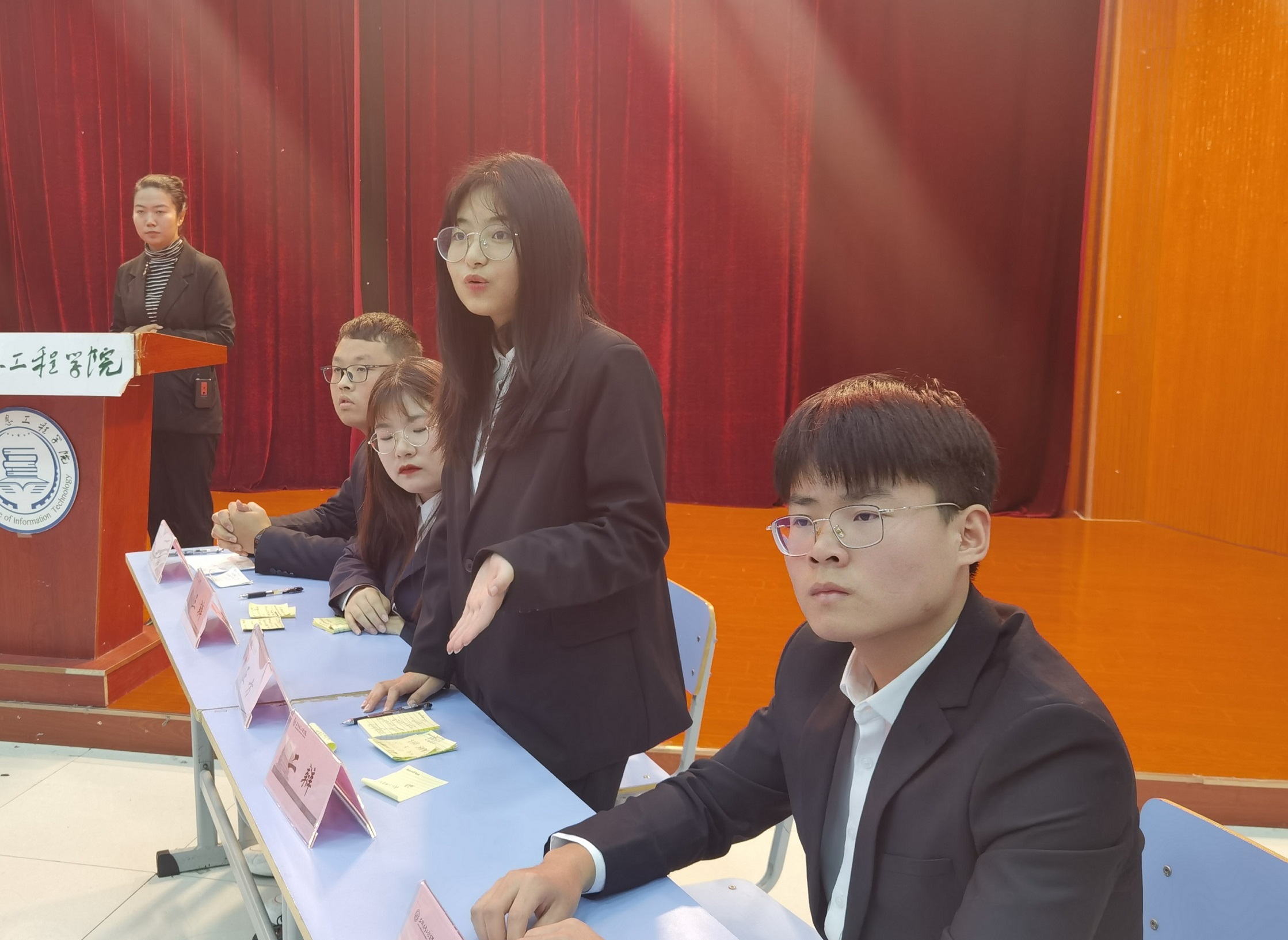 历经班级内部赛、院级初赛(十四晋七)、复赛(七晋四)、半决赛(四晋二),12月10日在A2E101教室,决赛正式打响。院长柴阜桐、院长助理于鹏、樊钒、学工秘书韩海东、团总支书记张梦蝶,以及专业教师王清清、张继东担任评委。