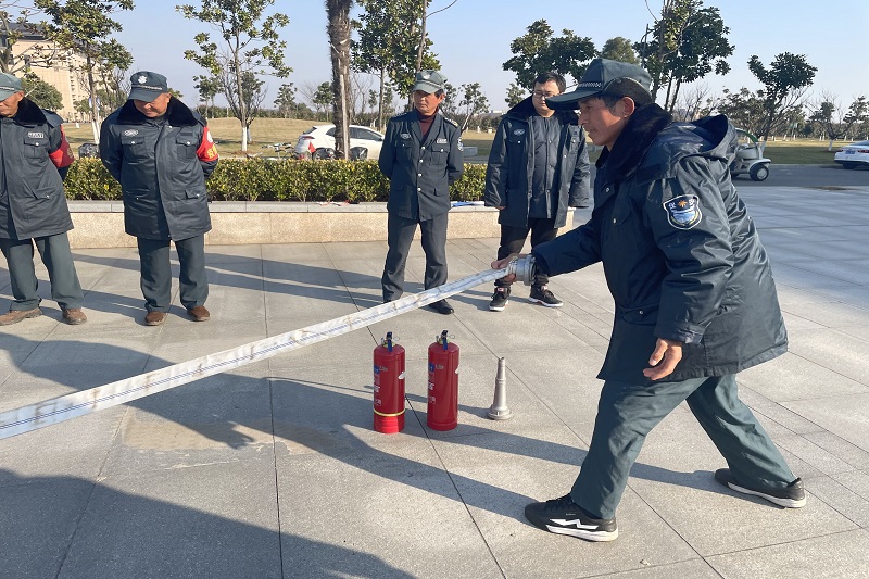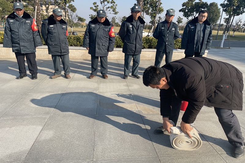 随后进行了消防器材的实战演练,主要开展消防水带两带链接训练、水带抛打训练,全体队员逐个上前使用消防器材,通过实际操作,每位队员都学会如何快速有效扑救初期火灾,对于一些动作不规范的队员,安保主管对他们的动作予以纠正。