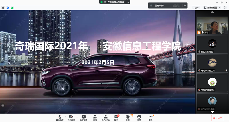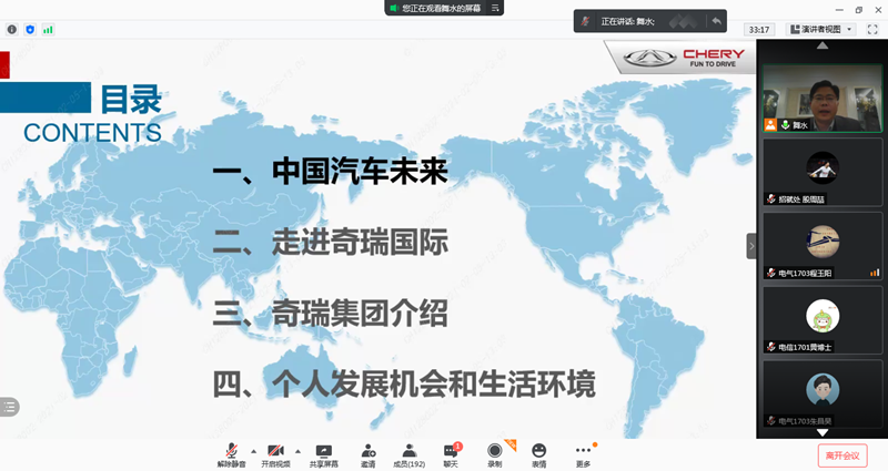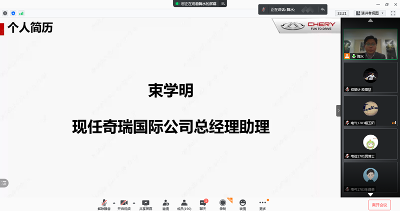 本网讯 为有效推动我校2021届毕业生就业率、就业质量双提升,2月5日,我校与奇瑞汽车国际公司为2021届毕业生联合举办了专场线上宣讲会。此次宣讲会奇瑞汽车国际公司带来了:国际销售管理方向、国际产品方向、国际品牌方向、国际服务支持方向、国际网络管理方向等对口岗位。奇瑞汽车国际公司总经理助理束学明先生主持宣讲,分别从“中国汽车未来”、“奇瑞国际公司介绍”、“奇瑞集团介绍”、“个人发展和生活环境”等四个方面为毕业生做了详实的推介。