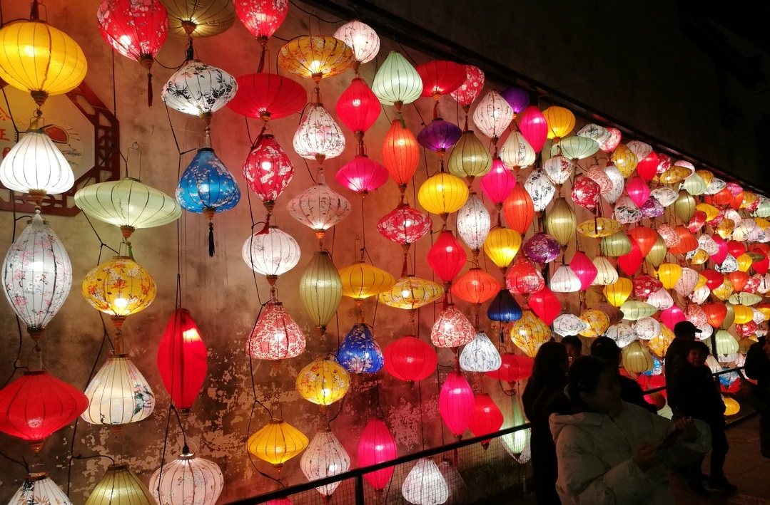 (儿时,爷爷总会在过年这天带着我去商贸市场购置各式各样的灯笼,这是记忆中仍嗅得到浓浓年味的信息素。踏上石板路,欣赏着小桥流水,游鱼嬉戏,在残存着些许青苔的徽派建筑的石墙上,一盏盏灯笼正绽放着它们生命中最美丽的瞬间。——周安琪 材料2001)
