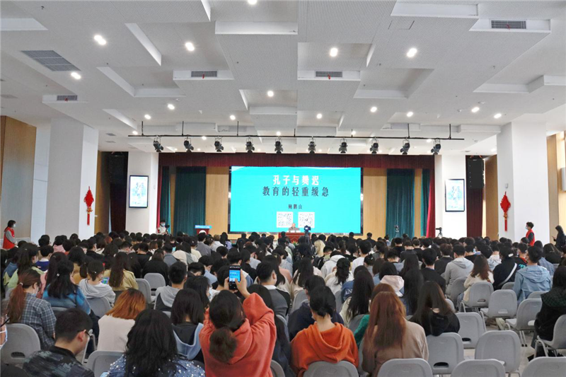 本网讯 3月30日下午,安徽信息工程学院A32楼学生活动中心座无虚席,掌声阵阵。在央视《百家讲坛》主讲“新说水浒”和“孔子是怎样炼成的”系列讲座的上海开放大学鲍鹏山教授做客做客安徽信息工程学院,为师生们带来了一场“孔子与樊迟——教育的轻重缓急”的专题学术讲座。讲座由校长吴敏主持,副校长葛付才、校长助理宋小秋、艺术设计学院执行院长袁立庠、副院长周建、叶克军等出席,与来自全校各个专业的400余名学生聆听了讲座。