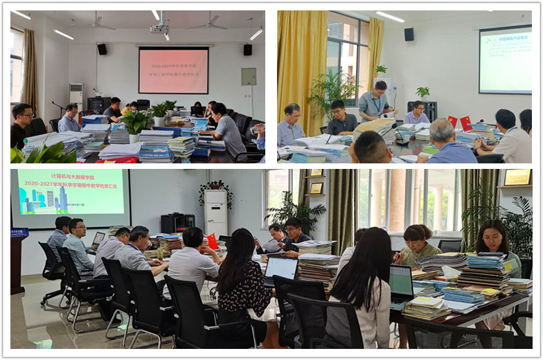 学校检查阶段,由学校领导,校级督导、学校督察督办及教务处相关人员组成的校级检查小组,分别到各学院进行了为期一周的期中教学检查工作。此次检查分为两部分:一是检查组通过听取汇报、召开教师座谈会、检查教学材料和实地查看实验室管理等方式,对教学计划的落实情况进行抽查,并着重抽查了课堂教学改革、教学过程性考核实施情况、课程思政建设以及教研活动开展情况。二是检查组对所有课程教学大纲编制质量及近三学年考核归档材料质量检查的整改情况进行了追踪检查,并在现场就检查的总体情况和突出问题做了反馈和交流。