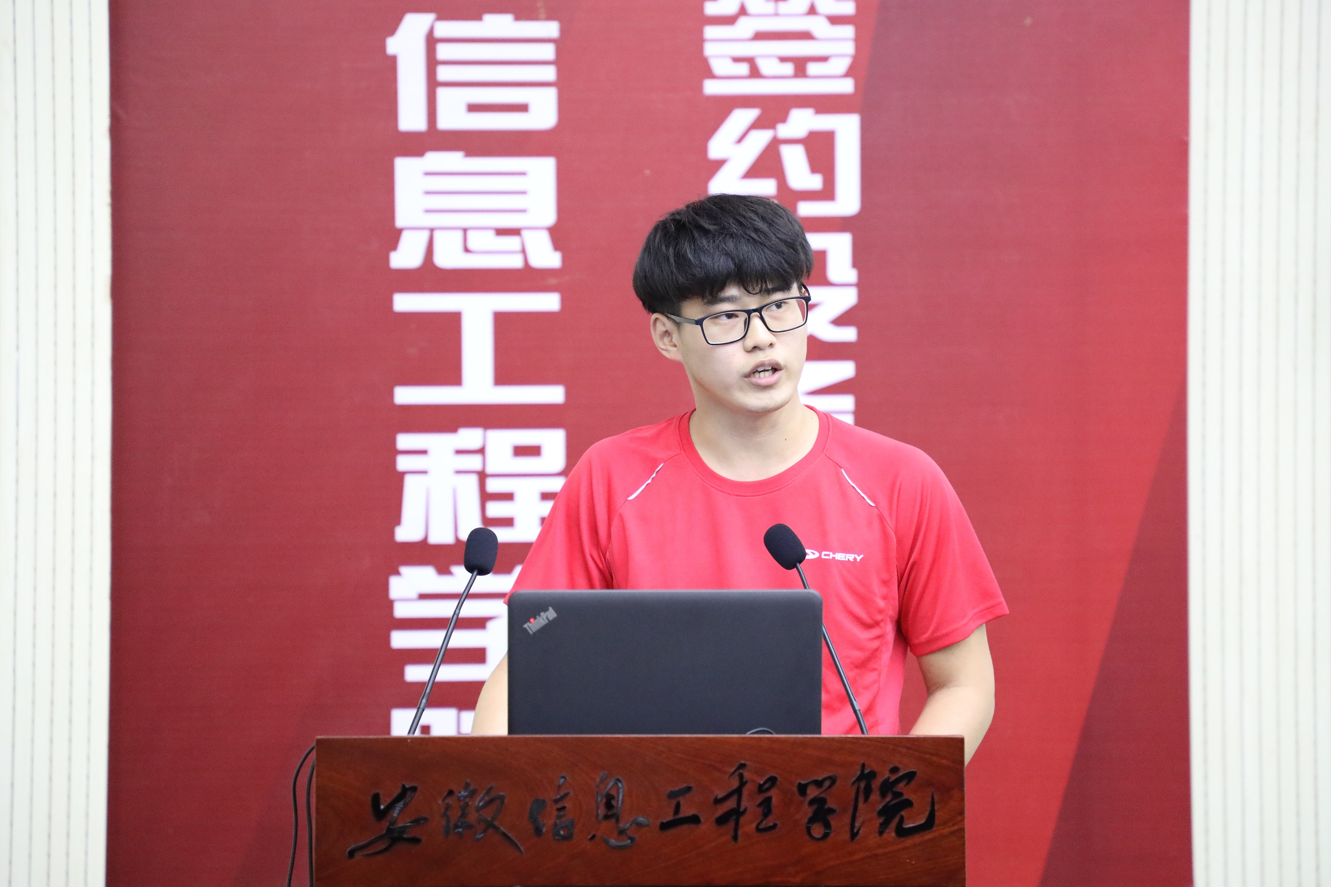 车辆1804班李金鑫作为本期奇瑞卓越工程班学员代表发言,感谢学校与公司提供的宝贵机会。他表示,培养班全体同学将珍惜机会,做到致知于行,在学习与实践中下功夫、练本领、提素质,展现安信工学子风采。
