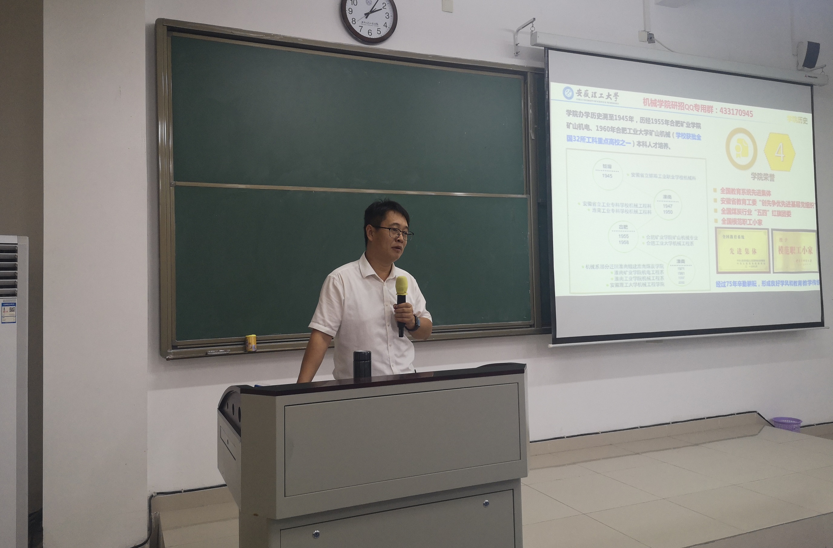 本网讯 为进一步提高机械工程学院学子考研的积极性,增强学生考研的信心,同时,推进考研学生的假期管理,7月2日下午,机械工程学院于博学楼W202教室举办考研学生假期管理及辅导宣讲会。安徽理工大学、安徽科技学院相关负责人应邀作考研辅导宣讲,学院18级辅导员及有考研意向的学子参加了本次宣讲会,孙奇慧主持会议。