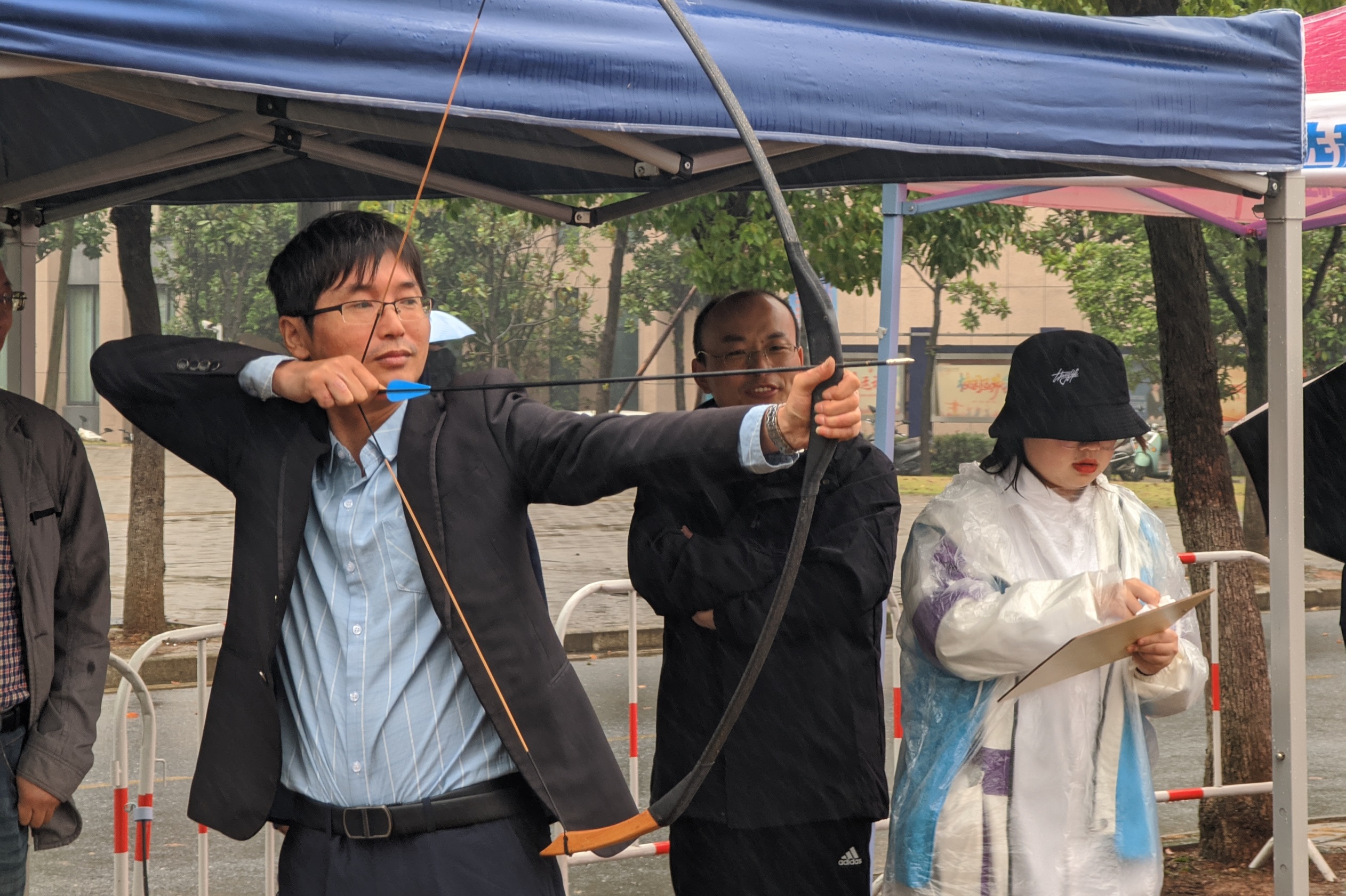 此次教职工运动会除了设置常规田径项目比赛之外,还有射箭、飞镖、爱的魔力转圈圈、旱地龙舟、拔河等多项趣味比赛。尽管秋风瑟瑟,秋雨绵绵,但老师们依旧兴致盎然,认真进行热身等赛前准备。团体项目老师们更是玩得不亦乐乎,比赛异常激烈,同学们都随着比赛加油助威,场面十分热闹。比赛过程充满趣味性,又富有挑战性。老师们战绩斐然:季甜甜获女子甲组200米第一名,黄俊玲获女子甲组射箭第二名,刘羽获女子丙组飞镖第三名;赵帅帅获男子甲组200米第三名,王毛毛获男子甲组飞镖第三名;混合4×100米比赛第二名,“爱的魔力转圈圈”团体第三名等等。