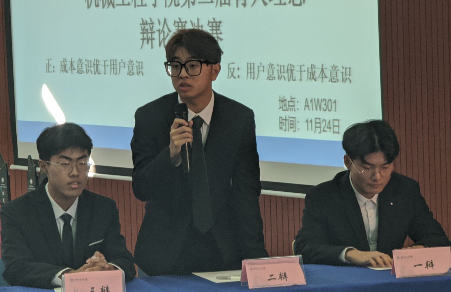 经过初赛、复赛、半决赛的激烈比拼,车辆2101班和材料2101班最终站上决赛对战台。决赛辩题围绕成本与用户的关系展开辩论。正方是车辆2101班,他们的观点是成本意识优于用户意识;反方是材料2102班,他们的观点是用户意识优于成本意识。