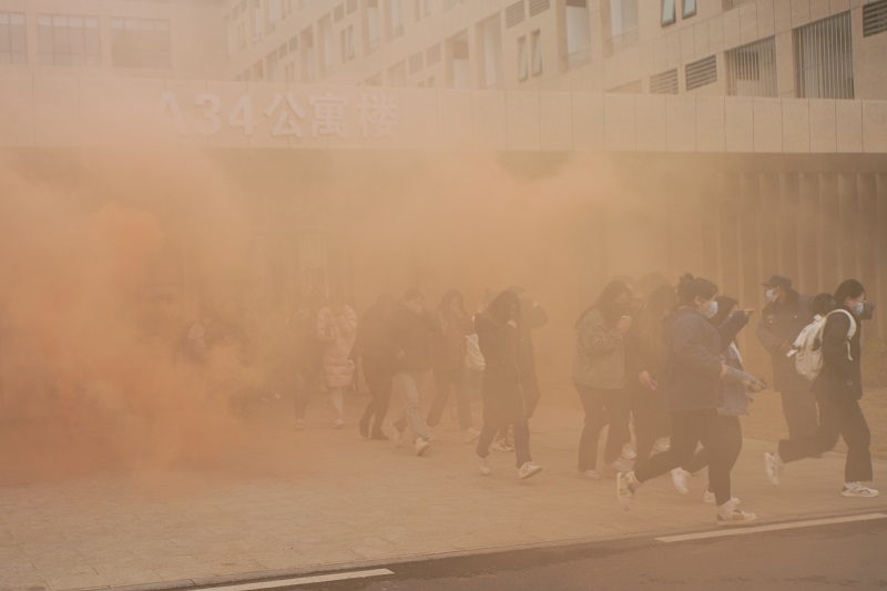 为突出本次演练火场的真实性,保卫处将烟雾弹燃放区设置在寝室阳台外及宿舍门口,并假设A34宿舍楼三楼寝室因电线短路发生火灾,一名伤员被困。下午13时,演练正式开始,经宿管员模拟报警求助,上报准确火警位置后,保卫处燃放烟雾弹,立即组织安保人员到场警戒,义务消防员开展火情侦察,协助宿管员引导学生用湿毛巾或衣物捂住口鼻,弯腰前进,有序撤离至楼外音乐广场集合