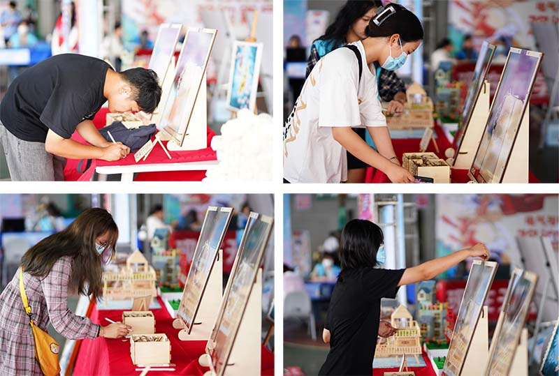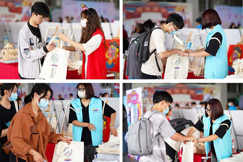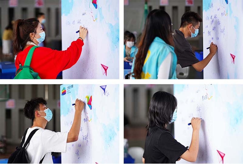 除去常规的迎新引导流程外,艺术设计学院还为到来的新生们策划了特别的纪念活动。每一位到来的新生在核对个人信息后可以领取一个由学院提前准备的手提袋,并会被引导至“签到壶”的位置,将自己的姓名写在心形的小木片上,将小木片投入到印有艺术设计学院精心准备的祝福语的透明画框里,别具一格的迎新小活动让小萌新们在惊喜之余感受到了学院浓厚的温馨氛围。