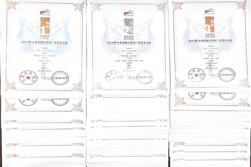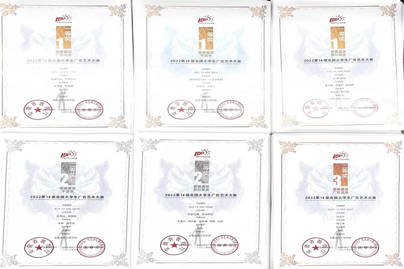 大广赛共设平面、影视、互动、策划案、广告语、长文案等6个分类,由于我校之前报送作品较多且成绩较突出,本次安徽赛区大赛组委会对参赛作品数量也进行了要求。艺术设计学院认真总结了前期比赛经验,组织经验丰富的指导老师参与竞赛指导中,使此次大赛的参与度、参与热情、参赛氛围得到进一步提高。在校赛中,校赛组委会收到了500余件学生作品,并评出校级奖项160个,最终报送了400件作品到第十四届全国大学生广告大赛安徽省赛区,最终获得一等奖21个、二等奖36个、三等奖58个,共计115个省级奖项,有14名老师被评为优秀指导教师。