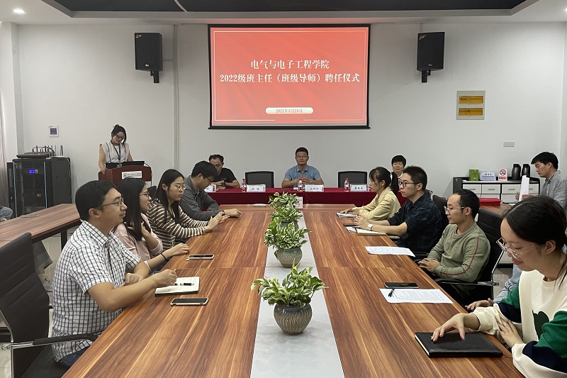 本网讯 为进一步加强班主任队伍建设,扎实推进学院班主任工作的开展,不断提升班级管理水平,同时也为了充分发挥优秀班主任的“传、帮、带”作用,促进青年班主任的快速成长,电气与电子工程学院于9月29日在博识楼S403举行电气与电子工程学院2022级班主任聘任仪式。电气与电子工程学院执行院长马利祥,副院长陈振、梁美玉、王伟,院长助理刘蕾,学工秘书曹栋,教科研秘书陶旺发,全体班主任,2022级辅导员及2022级学生代表参加本次仪式。