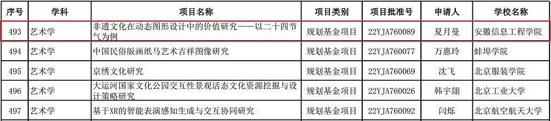 2022年度,教育部人文社会科学研究(艺术学)规划基金项目共立项112项,青年基金项目共立项142项。我校艺术设计学院夏月曼副教授主持的规划基金项目《非遗文化在动态图形设计中的价值研究——以二十四节气为例》和艺术设计学院薛遥老师主持的青年基金项目《汽车人机交互界面的适老化设计研究》通过专家严格评审,脱颖而出,成功获批立项。