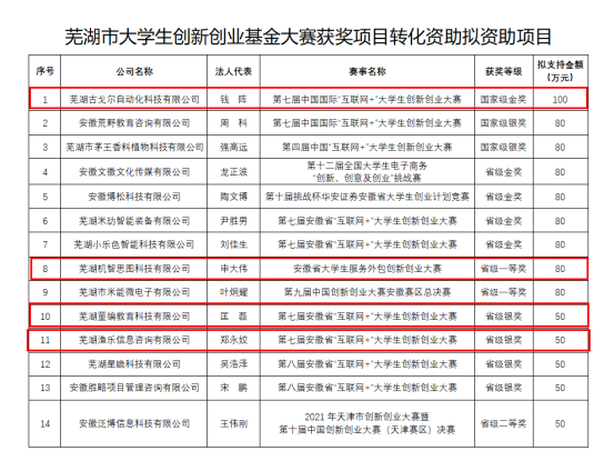本网讯 近日,根据《芜湖市财政局关于印发芜湖市大学生创新创业基金管理办法的通知》(财金〔2021〕681号)和《芜湖市财政局关于修改芜湖市大学生创新创业基金实施细则的通知》(财金〔2022〕525号)有关规定,各创业项目提交大赛获奖项目转化资助及“科技型中小企业”创业资助材料,学校大学生创业管理中心初审,芜湖市人才发展集团对项目进行审核并公示,最后确定我校7个项目获得资助,资助金额共290万元,占总资助金额22%。