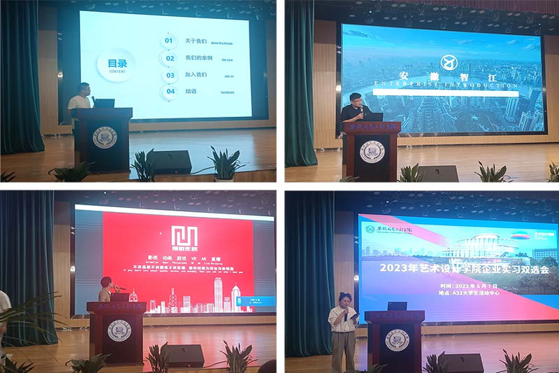 本网讯 为实现校企信息资源双赢共享,推动双方共同发展,全力促进2020级学生顺利落实实习岗位,促进毕业生高质量就业,6月7日下午,艺术设计学院在A32大学生活动中心举办2023年企业实习动员及双选会,艺术设计学院副院长周建、骆琼,院长助理金亮,辅导员胡亚男,芜湖海尔全屋定制、浙江义乌零远科技有限公司、芜湖慨晨文化传媒有限公司、芜湖易比一模型科技有限公司、安徽卫视男生女生向前冲栏目组、安徽智江信息科技有限公司、地标马克、慕维影视传媒有限公司、上海开艺设计集团有限公司代表出席了本次会议。