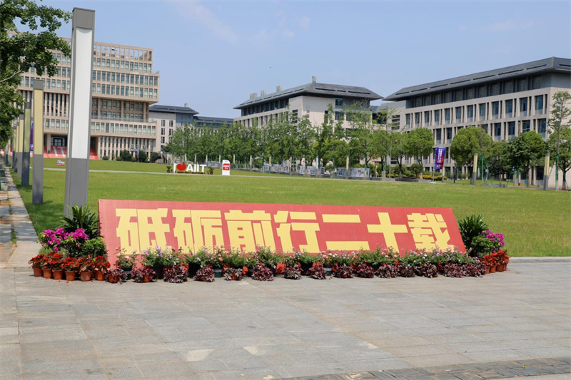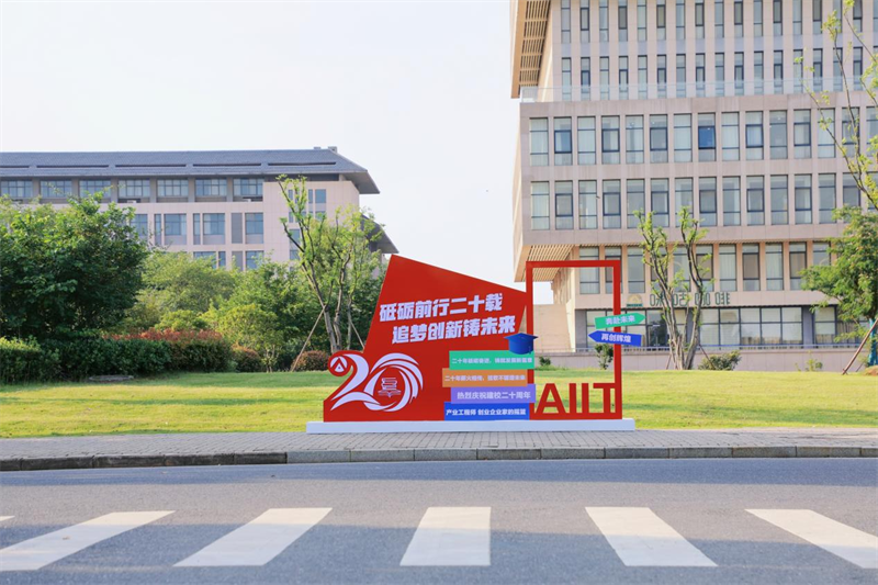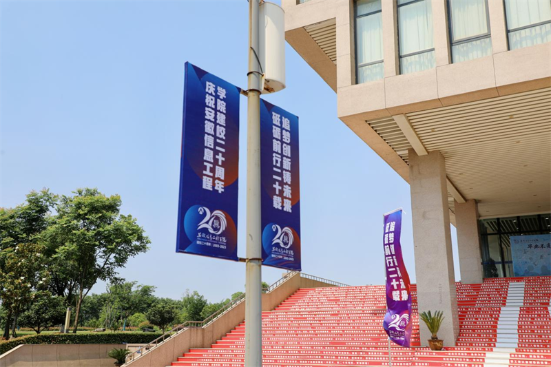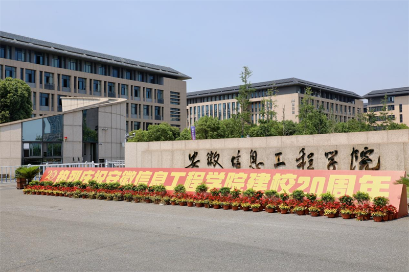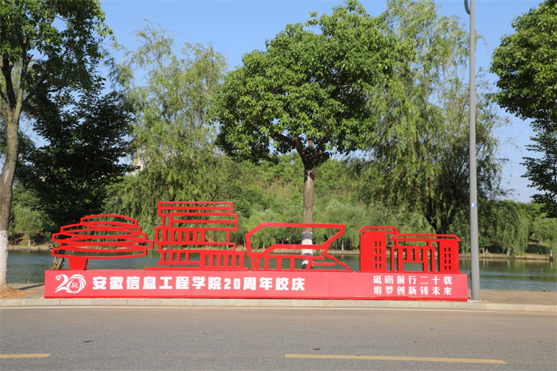 在学校东门外,灿烂的鲜花簇拥着“热烈庆祝安徽信息工程学院建校二十周年”展板;走进校门,校庆主题“砥砺前行二十载 追梦创新铸未来”左右呼应,既为校园增添色彩和美感,也渲染出浓浓的节日气息。