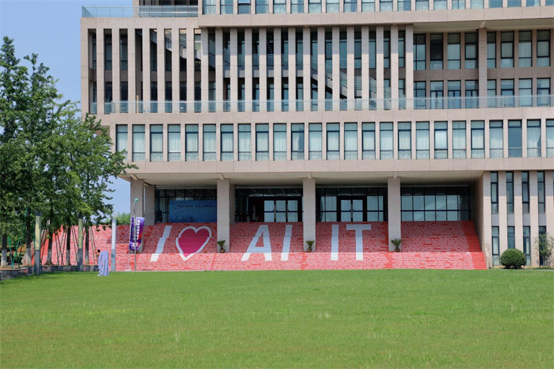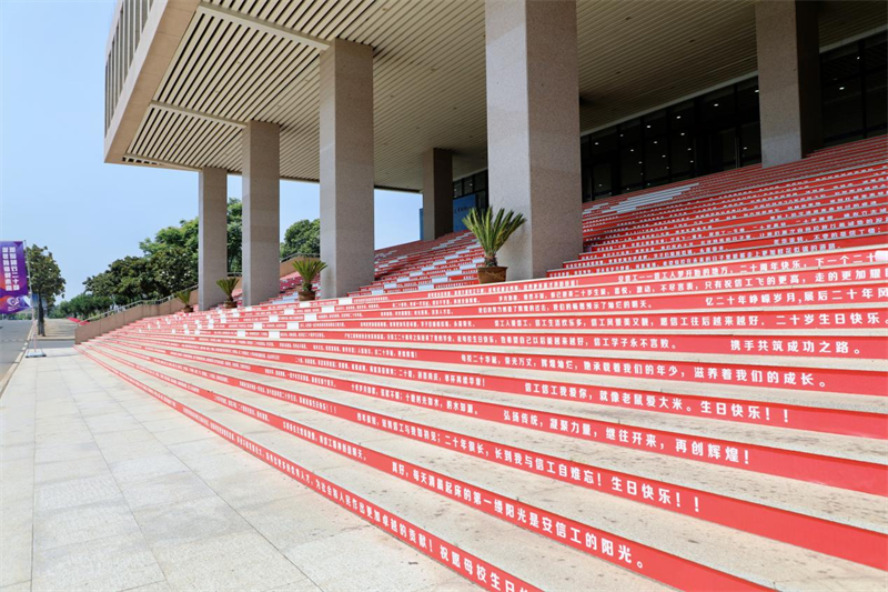 图书馆入口处的台阶上,贴满了师生和校友们为母校送出的祝福,“风华廿载,再续华章”“安信工,梦开始的地方”,一句句情真意切的祝福构成了I LOVE AIIT的字样。