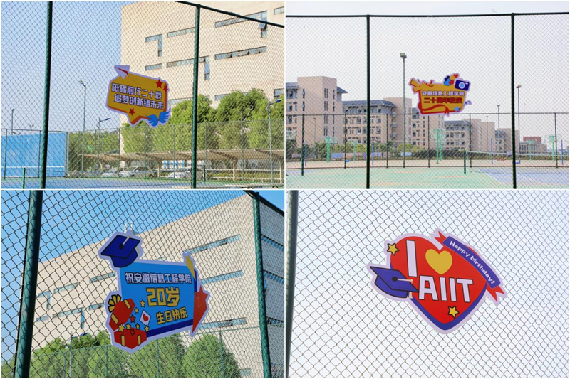 校园内随处可见二十周年校庆的道旗和水牌,宿舍区前的运动场护网上,点缀着祝福的标识,营造出一片喜庆、欢乐的气氛,信工师生们为即将到来的二十周年校庆心怀期待与祝福。