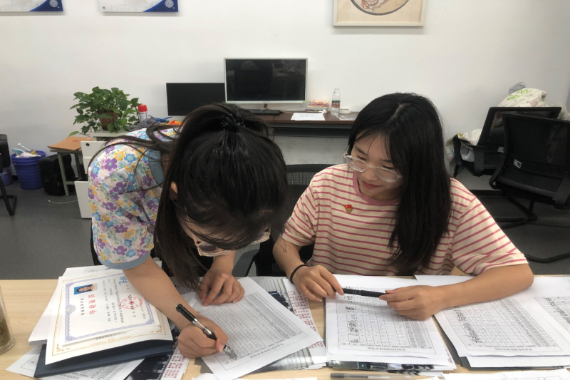 (图为党员为同学们登记整理材料)