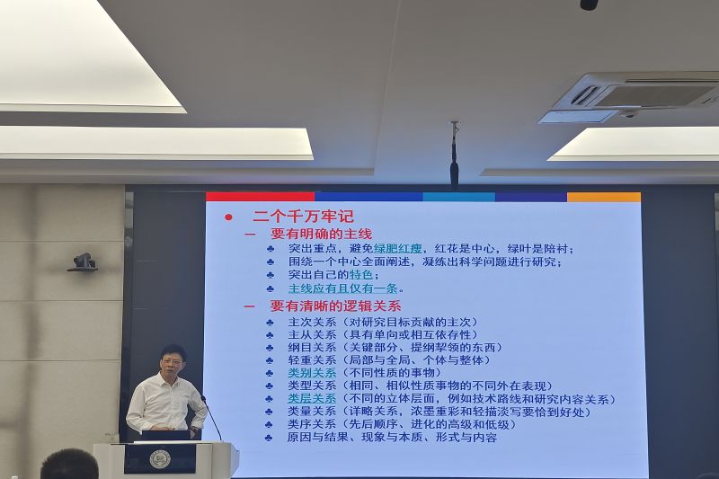 在分享申请书撰写体会时,陈伟海教授提出了“两个牢记、三个突出、四项主要内容、五项基本原则”的撰写策略。他强调,申请书要牢记要有明确主线、要有清晰的逻辑关系;突出科学问题、突出创新、突出原创;同时,申请书要重视项目的选题、立项依据、研究内容、技术路线等四项主要内容,并遵循复杂问题简单化、专业问题科普化、技术问题科学化、语言要有可读性、排版要有可视性五项基本原则。结合自己多年成功申请的经验,陈伟海教授根据申请书的模板要求,详细解析了各个部分的撰写要点和注意事项,使在场师生受益匪浅。