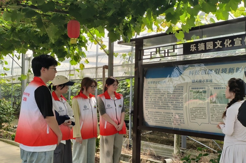 葡萄园里,翠绿的藤蔓下挂满了晶莹剔透的果实,志愿者们穿梭其间。在向导老师专业的介绍下,志愿者们了解到了园内葡萄品种的多样性,其生长周期的规律性以及园区种植方式的严谨性与创新性。通过聆听向导老师的介绍,志愿者们见证了葡萄园的创新农业种植系统与可持续种植技术,他们在介绍学习中感受到,每一颗葡萄背后都是自然与人类智慧的和谐共鸣,使他们不禁对智慧农业的发展产生了浓厚的兴趣。