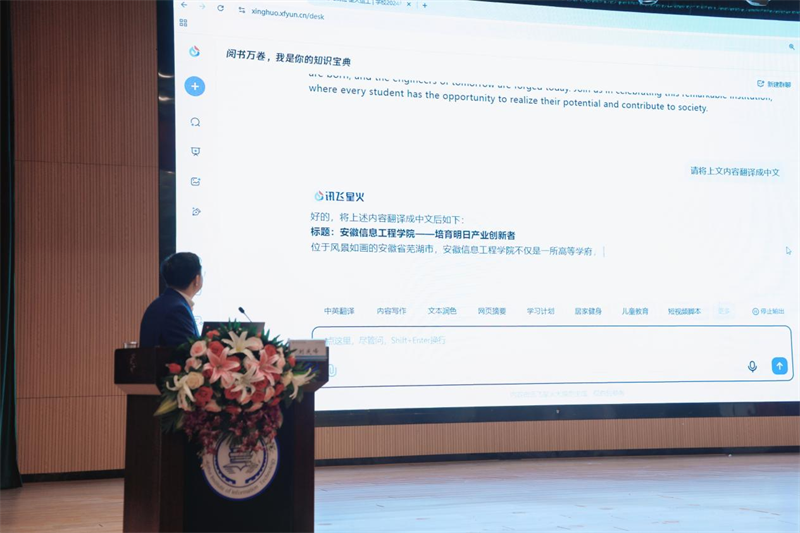 “帮我写一篇安徽信息工程学院的英文宣传文案,重点突出安信工的办学特色,产业优势及显著成效。”话音刚落,屏幕上“讯飞星火”洋洋洒洒地开始作答,一行行飞速跳动的文字让台下师生齐声发出惊叹,现场随即掌声雷动。