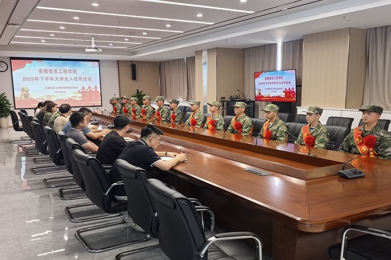本网讯 金秋送爽,军歌嘹亮。9月15日下午,学校在综合科技楼一楼会议室隆重举行2025年下半年大学生新兵入伍欢送大会,为即将奔赴军营的学子们壮行。学校征兵工作领导小组全体成员、湾沚镇征兵工作负责同志、入伍新兵及家长代表参加了大会。