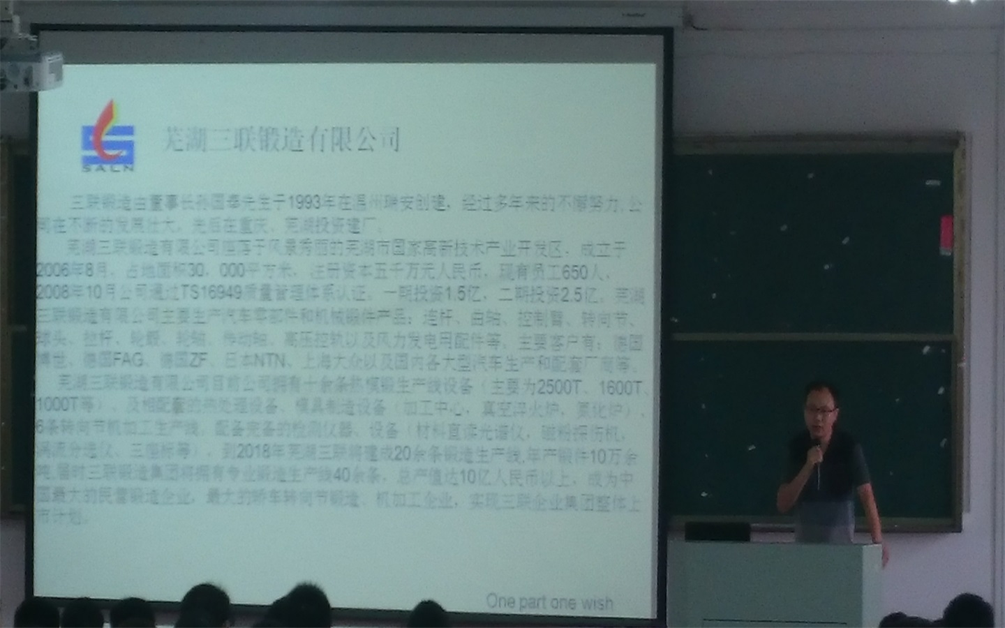 6月30日下午14:30,机械工程系邀请了芜湖三联锻造有限公司、芜湖亚奇汽车部件有限公司在西二503教室举办实习招聘宣讲会。此次实习招聘宣讲会主要面向机械工程系2012级学生。