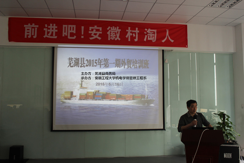 受芜湖县政府的委托,根据学院的安排,管理工程系走出校门承办芜湖县“涉外企业外贸人员培训班”。首期培训开班仪式于5月16日上午8点30分在芜湖县“新芜电商产业园”会议室举行。芜湖县商务局开发区分局局长王思文,安徽工程大学机电学院管理工程系主任助理陆爱平、主讲老师王春荣以及四十余名涉外企业外贸业务人员出席了本次仪式。