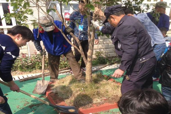 为了绿化环境,美化地球家园,基础教学部学生会联合芜湖森林物业公司,于3.12植树节为鲁港ABC幼儿园栽种树木。