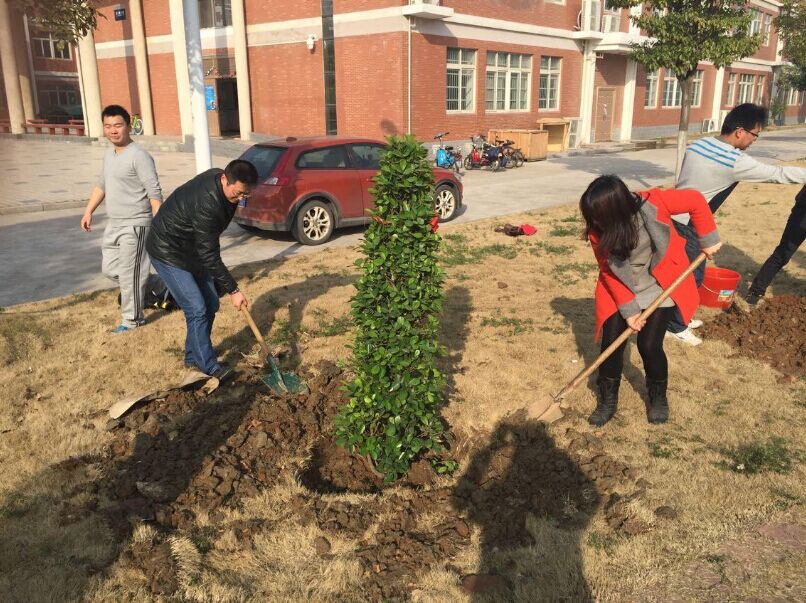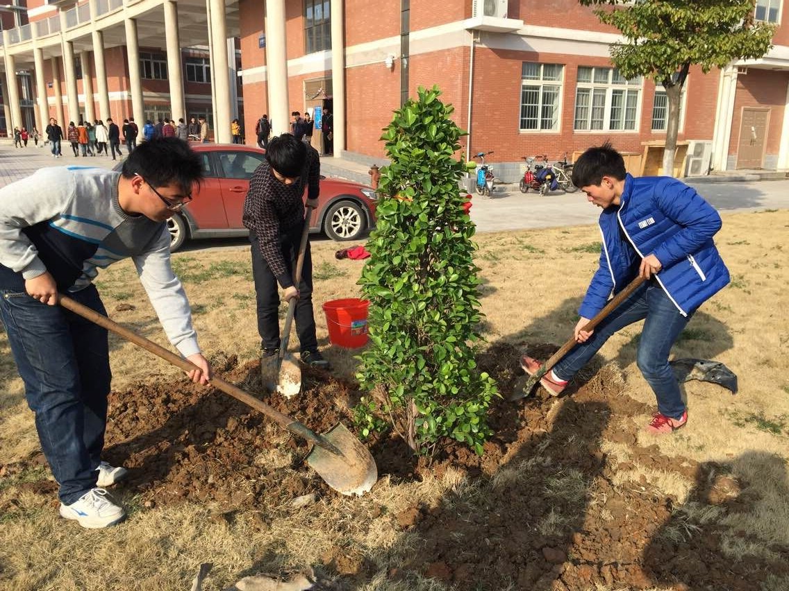 3月12日中午,18名学生志愿者与老师一起带着铁锹、水桶等工具来到植树现场。由于草坪下石块较多,在此种树对挖坑深度、土质的松紧程度和水的浇灌要求较高。植树现场,和煦的春风鼓舞着志愿者们的热情,大家团结协作,井然有序,为共创美丽校园而努力奋斗。植树活动结束后,同学们给小树挂上亲笔签名的标签并与小树合影留念,约定共同看护小树苗。至此,此次植树活动顺利结束。